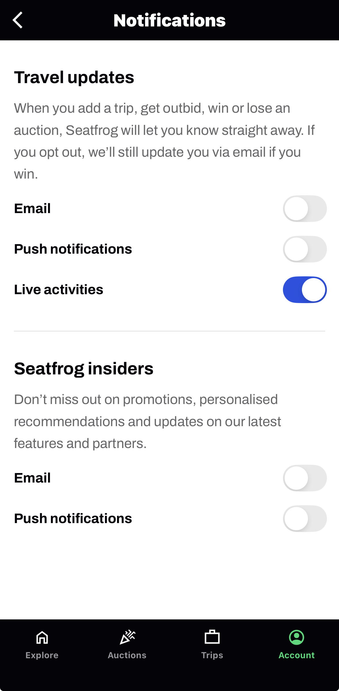 You can control how and when Seatfrog contacts you, including emails, push notifications, and Live Activities.