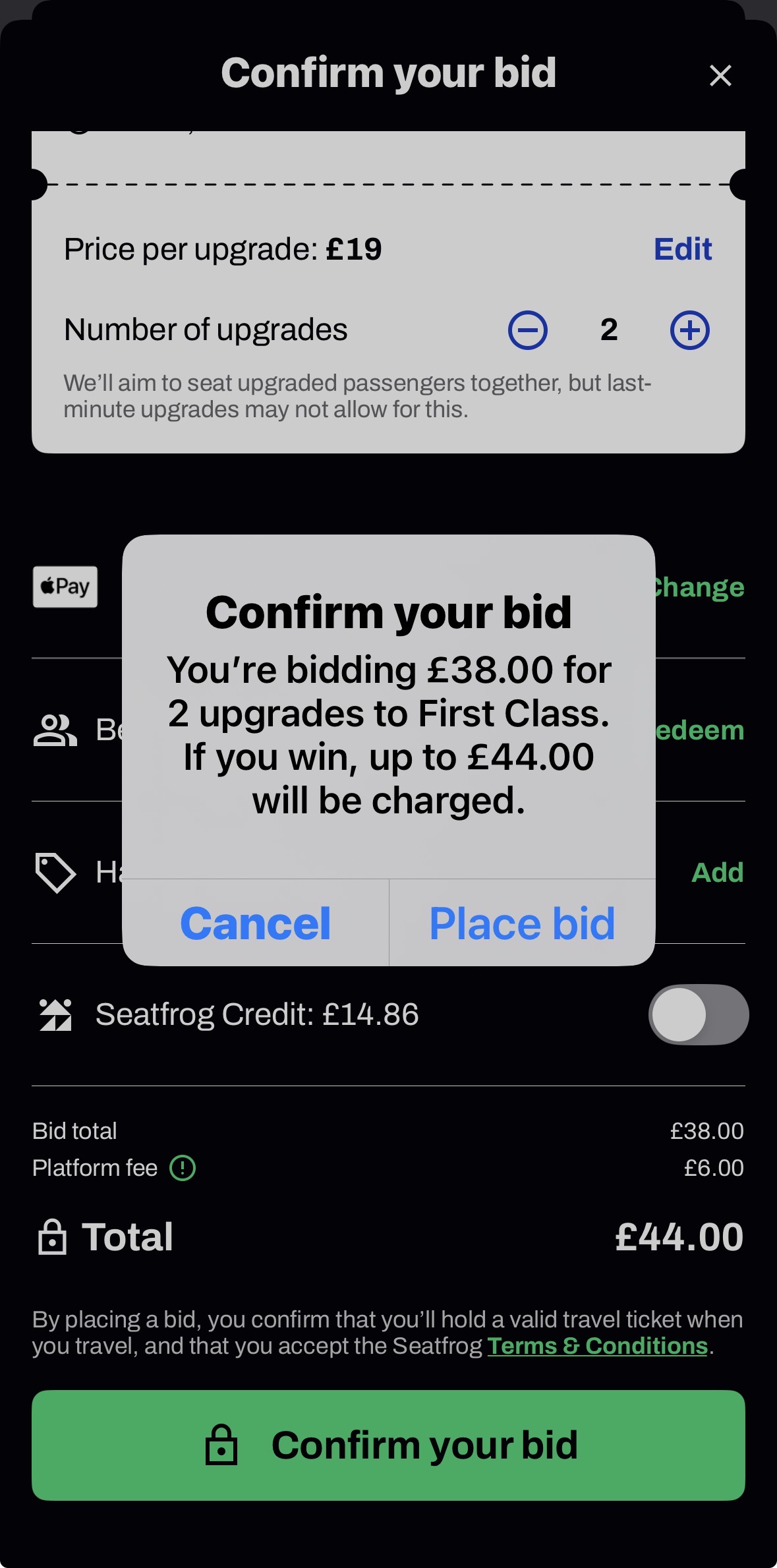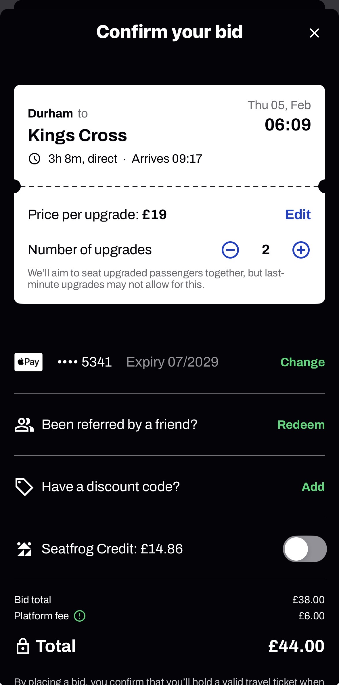 When you select to bid on more than one upgrade, your bid amount will be multiplied by the number of upgrades you’ve chosen to bid on. For example, the image below outlines that this passenger has chosen to bid on 2 upgrades to the amount of £19 each. This is a total of £38 for the upgrades (up to £44 includes platform fee charges). You must tap ‘place your bid’ to confirm this action and progress in the auction.